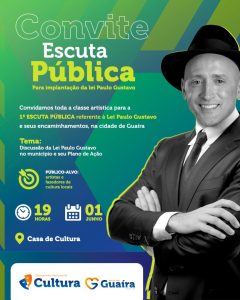 A Prefeitura de Guaíra, através do Departamento Municipal de Cultura, promove a 1ª Escuta Pública sobre a Lei Paulo Gustavo (Lei Complementar 195/2022) nesta quinta-feira, 1º de junho de 2023, às 19h, na Casa de Cultura “Professor João Augusto de Melo”, juntamente com o Conselho Municipal de Cultura.