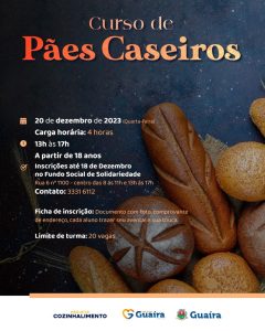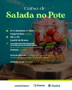 Na quarta, 20/12, ocorrerá a aula de “Pães Caseiros”, com carga horária de quatro horas, sendo das 13h às 17h; e o de “Salada no Pote”, no dia 21/12, quinta-feira, das 13h às 17h.Lembrando que todos os participantes devem levar seu avental e touca.