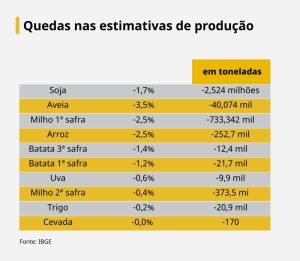 Na comparação entre as pesquisas de fevereiro e janeiro, o IBGE destacou variações negativas nas seguintes estimativas de produção.