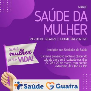 O mês de março é “Lilás” (mês de conscientização sobre a importância de se prevenir contra o câncer do colo do útero) e “Amarelo” (conscientização e combate à endometriose) e a Prefeitura, dentro das atividades do “Guaíra Delas – Mulheres em Foco 2023” está com uma programação mais intensa de prevenção e orientação no que tange a saúde da mulher.