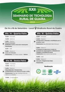Organizado pelo Sindicato Rural, Federação da Agricultura do Estado de São Paulo (FAESP), Serviço Nacional de Aprendizagem Rural (SENAR) e Serviço Brasileiro de Apoio às Micro e Pequenas Empresas (SEBRAE/SP), o seminário trará uma série de palestras que trarão informações atuais sobre temas relacionados ao agronegócio brasileiro.