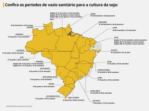 O vazio sanitário é uma ferramenta adotada para inibir ou reduzir a propagação de doenças e pragas nas lavouras nacionais. No caso da cultura da soja de 2023, o período foi estabelecido pelo MAPA no último dia 10 de abril, com a publicação da portaria nº 781, que determina um calendário para cada estado produtor, em que, por pelo menos 90 dias, não se pode plantar soja, além de ser proibido a manutenção de plantas vivas do grão. Com a medida, o ministério visa controlar a incidência da Ferrugem Asiática, uma das principais vilãs da sojicultura nacional.