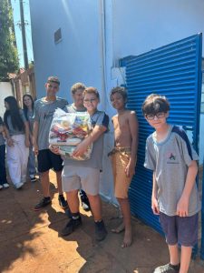 Entre provas dinâmicas, jogos e desafios de cooperação, um dos momentos mais significativos da gincana foi a campanha de arrecadação de alimentos, uma das tarefas que valiam pontuação para as turmas participantes. A ação mobilizou os estudantes, que se organizaram em equipes e se empenharam para arrecadar o maior número possível de doações.