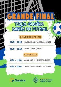 Já na quinta (27), a festa continua no Complexo Poliesportivo Ramize Elias. A bola rola primeiro no Sub-12, com Ajax e Minicraques em busca do título. Fechando a taça com chave de ouro, FMO e Fanáticos se enfrentam pela decisão do Sub-16.