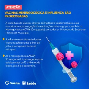 Já a meningocócica ACWY (Conjugada) foi prorrogada para adolescentes de 13 e 14 anos de idade, até 31 de dezembro. Esta medida tem por finalidade a proteção contra a Doença Meningocócica – DM pelos sorogrupos A, C, W e Y, além de otimizar o uso das doses desta vacina, em virtude do seu baixo consumo nos últimos anos e da existência de quantitativo de doses da mesma. A vacina está indicada para adolescentes de 11 a 12 anos no calendário de rotina.